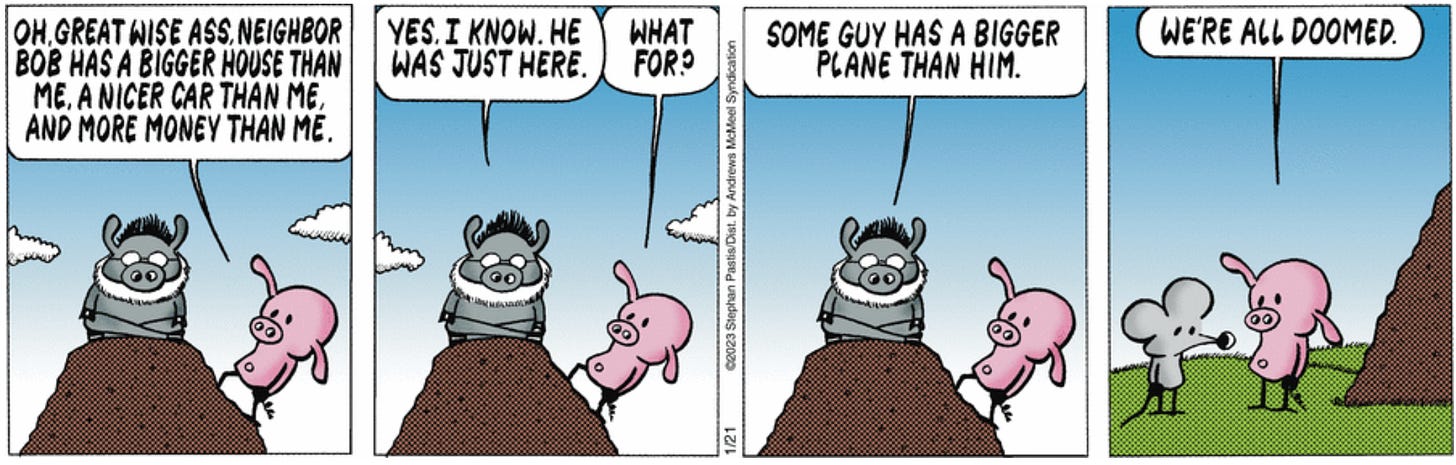 I am not saying, "Everyone is stupid except me." This is just a note on how natural selection has programmed our brains. We live on the hedonic treadmill, where we acclimate to anything good and always always always want more.