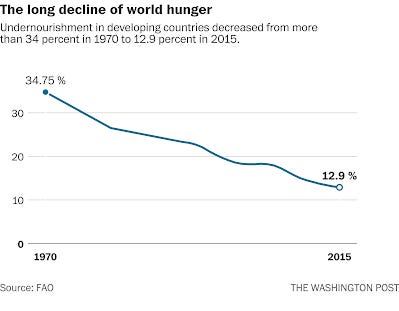 “Population will inevitably and completely outstrip whatever small increases in food supplies we make,” Paul Ehrlich confidently declared in the April 1970 issue of Mademoiselle. “The death rate will increase until at least 100-200 million people per year will be starving to death during the next ten years.”